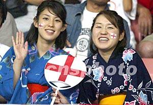 圖:日本女球迷為英格蘭隊助威 2002年06月15日 22:52 ![]() 世界杯足球賽八分之一決賽十五日在日本新瀉開賽,英格蘭隊(白衣)以三比零大勝丹麥而進入八強。圖為身穿和服的日本女球迷為英格蘭隊助威。作者:毛建軍