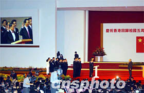 中新社香港七月一日電(記者張傳熙黃少華)慶祝香港回歸五周年大會(huì)暨第二屆香港特區(qū)政府就職典禮今天上午在香港會(huì)展中心新翼大會(huì)堂舉行。香港特別行政區(qū)第二任行政長(zhǎng)官董建華和第二屆特區(qū)政府十九名主要官員在莊嚴(yán)的儀式上宣誓就職。 世界的目光今早再度投向美麗的香港。座落在維多利亞港畔的香港會(huì)展中心新翼大會(huì)堂今早燈光璀璨,嘉賓如潮。紅色成了就職典禮的主色調(diào):呈梯形狀的主席臺(tái)上鋪著紅色地毯,政府官員沿著紅色臺(tái)階,魚(yú)貫登臺(tái)宣誓。 這標(biāo)志著香港特區(qū)首屆政府已順利完成歷史使命,繼任的新一屆政府已全部到位并開(kāi)始運(yùn)作。 出席儀式的國(guó)家主席江澤民代表中央政府和全國(guó)各族人們,向新就任的特區(qū)第二任行政長(zhǎng)官董建華和第二屆政府主要官員、行政會(huì)議成員表示祝賀。江澤民還在會(huì)上發(fā)表講話,希望特區(qū)政府與各界人士與時(shí)并進(jìn),積極進(jìn)取,努力創(chuàng)造香港更加美好的未來(lái)。 上午,鮮花、綠樹(shù)裝點(diǎn)的香港會(huì)展中心新翼五樓大禮堂一片喜慶。會(huì)場(chǎng)正中的主席臺(tái)上方,懸掛著國(guó)旗和香港特區(qū)區(qū)旗。江澤民主席在行政長(zhǎng)官董建華的陪同下步入大會(huì)堂時(shí),全場(chǎng)二千名嘉賓起立鼓掌,向江澤民的到來(lái)表示熱烈歡迎。 八時(shí)五十九分,就職典禮在雄壯的國(guó)歌聲中拉開(kāi)帷幕。最先走上主席臺(tái)宣誓就職的是行政長(zhǎng)官董建華。國(guó)家主席江澤民監(jiān)誓。董建華莊嚴(yán)地舉起右手,宣誓:“本人就任中華人民共和國(guó)香港特別行政區(qū)行政長(zhǎng)官,定當(dāng)擁護(hù)中華人民共和國(guó)香港特別行政區(qū)基本法,效忠中華人民共和國(guó)香港特別行政區(qū),盡忠職守,遵守法律,廉潔奉公,為香港特別行政區(qū)服務(wù),對(duì)中華人民共和國(guó)中央人民政府和香港特別行政區(qū)負(fù)責(zé)”。 宣誓畢,江澤民主席和董建華緊緊握手,全場(chǎng)掌聲如潮。 五年前的今天,董建華第一次宣誓就任首屆特區(qū)行政長(zhǎng)官。從那時(shí)起,香港的歷史改寫(xiě)了,香港回到了祖國(guó)的懷抱,開(kāi)始了港人治港的新里程。今天董建華再次宣誓就職,不同的是,他標(biāo)志著新一屆特區(qū)政府將承前啟后管治香港,對(duì)香港的未來(lái)將會(huì)有更多的承擔(dān)。 接著,江澤民監(jiān)誓下宣誓就職的還有由董建華提名、中央政府任命的第二屆特區(qū)政府十九名主要官員,包括三司十一局以及警務(wù)處、入境處、海關(guān)、廉政公署以及審計(jì)處官員。而改組后的行政會(huì)議十九名成員也在董建華的監(jiān)誓下,由政務(wù)司司長(zhǎng)曾蔭權(quán)帶領(lǐng)宣誓就職。 第二屆行政長(zhǎng)官董建華在宣誓禮畢后發(fā)表講話。他說(shuō),在我即將履行第二任行政長(zhǎng)官職責(zé)的時(shí)候,我意識(shí)到所面對(duì)的形勢(shì)是嚴(yán)峻的,擔(dān)任的責(zé)任是重大的。他說(shuō),帶領(lǐng)香港經(jīng)濟(jì)走出困境,恢復(fù)市民對(duì)前景的信心,是本屆政府面對(duì)的挑戰(zhàn)。 他表示,政府將竭盡所能,充分利用內(nèi)地經(jīng)濟(jì)發(fā)展的機(jī)會(huì),開(kāi)拓香港的發(fā)展空間,香港將會(huì)加快和廣東省的全面合作。他表示相信,過(guò)去五年的調(diào)整和適應(yīng),雖然歷盡艱辛,但卻又為香港將來(lái)的興旺奠定了基礎(chǔ)。他相信香港在各界的精誠(chéng)團(tuán)結(jié)努力下,一定能夠走出困境。 江澤民主席在會(huì)上發(fā)表講話,充分肯定了香港過(guò)去五年所取得的成就。江澤民指出,香港回歸祖國(guó)以來(lái)的五年,是“一國(guó)兩制”由科學(xué)構(gòu)想變?yōu)樯鷦?dòng)現(xiàn)實(shí)的五年,也是董建華先生領(lǐng)導(dǎo)的特區(qū)政府團(tuán)結(jié)各界人士不斷克服困難、奮力前進(jìn)的五年。他說(shuō)今天的香港,“一國(guó)兩制”、“港人治港”、高度自治方針得到全面落實(shí),原有的資本主義制度保持不變,廣大居民繼續(xù)以自己習(xí)慣的方式生活。香港仍然保持著自由港的特色和國(guó)際貿(mào)易、金融、航運(yùn)中心的地位,繼續(xù)被公認(rèn)為亞洲乃至全球最具活力的地區(qū)之一。 江澤民說(shuō),事實(shí)充分證明,“一國(guó)兩制”是完全行得通的,董建華先生及其領(lǐng)導(dǎo)的特區(qū)政府是具有駕馭復(fù)雜局勢(shì)的能力的,香港人是完全能夠治理好香港的。他說(shuō),五年來(lái)我們所獲得的經(jīng)驗(yàn)和體會(huì),歸結(jié)起來(lái),就是在任何情況下都必須全面正確地貫徹“一國(guó)兩制”的方針和香港基本法,全力支持行政長(zhǎng)官和特區(qū)政府依法施政。 江澤民說(shuō),現(xiàn)在世界多極化和經(jīng)濟(jì)全球化趨勢(shì)深入發(fā)展,科技進(jìn)步日新月異,綜合國(guó)力競(jìng)爭(zhēng)日趨激烈,國(guó)際局勢(shì)正在發(fā)生深刻的變化。他說(shuō),中國(guó)正在實(shí)施現(xiàn)代化建設(shè)的第三步戰(zhàn)略目標(biāo),今后五到十年,也是香港經(jīng)濟(jì)和社會(huì)發(fā)展的關(guān)鍵時(shí)期。 江澤民在講話中,還提出三點(diǎn)希望:希望香港各界更好地適應(yīn