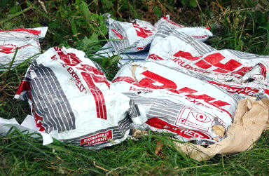 圖文:DHL公司的郵袋散落在地 2002年07月03日 14:36 德國當地時間7月1日夜(北京時間2日晨),一架DHL公司的波音757貨機和俄羅斯巴什基爾航空公司的圖-154客機在德國巴登-符騰堡州于伯林根鎮上空相撞并墜毀,至少已造成71人死亡,其中包括52名兒童。圖為DHL公司的郵袋散落在地。(春風)