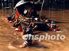 圖:廣東茂名二十萬人受水災海軍雨夜救人 2002年07月04日 18:10 ![]() 廣東茂名地區連降暴雨,二十萬人受災,其中數千人受洪水圍困。南海艦隊數百名海軍陸戰隊官兵雨夜馳援,展開搶險救災工作,安全轉移災民一千多人。圖為官兵們在救護受災群眾。作者:牛韓