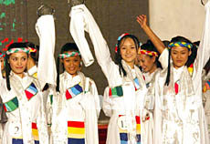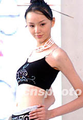 ![]() 選自中國各地的五十一名模特佳麗,十三日晚在西藏拉薩舉行的姍拉娜2002世界精英模特大賽中國選拔賽上進行角逐,來自的上海的選手石周靚獲大賽冠軍(右二)、來自北京的選手朱楠(左二)獲大賽商用冠軍、上海選手張靜獲亞軍(右一)、北京選手陳春獲季軍(左一)。 作者:錢興強