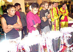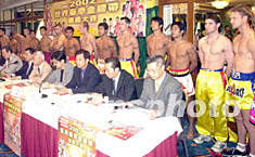 ![]() 2002世界泰拳金腰帶慈善大賽組委會十六日在澳門舉行新聞發(fā)布會,參賽的二十名各國選手在會上亮相。據(jù)悉,本次大賽的所有收益將撥捐中國水災(zāi)地區(qū)、澳門同善堂、澳門紅十字會及澳門工會聯(lián)合會職工福利基金會。李剛 攝