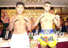 ![]() 2002世界泰拳金腰帶慈善大賽組委會十六日在澳門舉行新聞發(fā)布會,綽號“草原雄鷹”的中國選手格日樂圖(左)和對手在會上亮相。李剛 攝