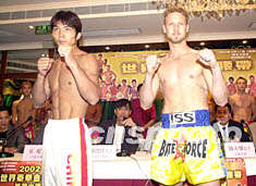 ![]() 2002世界泰拳金腰帶慈善大賽組委會十六日在澳門舉行新聞發(fā)布會,綽號“怪俠三毛”的中國選手王三楨(左)在會上與對手共同亮相。李剛 攝