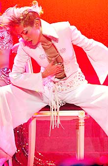據此間新明日報的報道說,在幾乎滿座的情況下,梅姐載歌載舞,散發了無窮的熱力。在前半場的表演,梅艷芳猶如展現服裝秀,鱷魚皮大衣,紅色鉆石晚裝等一一亮相于舞臺,另外,就像過去那樣,她的舞臺動作也極盡大膽,在演唱《憑什么》,把麥克積遜的經典舞臺動作重演一遍,雙手在身體敏感部位游動及觸摸,讓人看了臉紅耳赤。