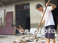 洪水退出后,長沙橘子洲二九四號居民李強正和妻子一起修補被洪水損壞的地面、墻體和門窗。作者:白祖偕