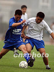 “李寧杯”第三屆北京業(yè)余足球會員聯賽三十一日鳴哨開賽。整個聯賽將歷時三個月,共有來自產業(yè)、高科技等行業(yè)的40支隊伍參加。圖為漢儒天正隊(藍)與來自一家律師事務所的萬思恒隊(白)在北京大學進行首場交鋒,后者以5:0的大比分獲勝。作者:武仲林
