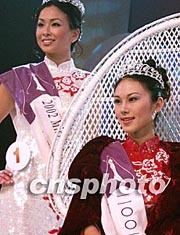 二00二年度紐約華裔小姐選美昨晚在曼哈頓揭曉,出生在中國廣東的今年二十歲的劉美誼艷(右)壓群芳、才藝過人,獲得冠軍,成為新出爐的紐約華裔小姐。出生在紐約的十九歲的汪慧之獲得亞軍。作者:龔文謨