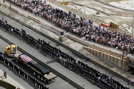 2002年5月30日,一輛卡車載著從世貿(mào)遺址中挖掘出的最后一道梁,經(jīng)過警察、消防隊(duì)員和遇難者家屬的隊(duì)列。這是世貿(mào)中心廢墟清理完畢時(shí)進(jìn)行的紀(jì)念活動的一部分。