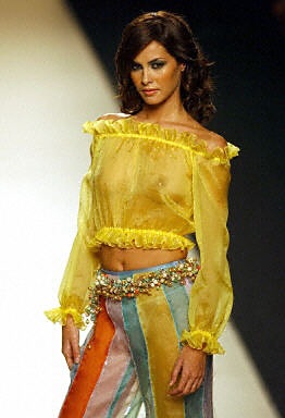 9月11日,西班牙馬德理舉行2003年春夏時裝表演,圖為一位模特展示透明裝。