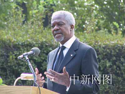 美國東部時間九月十一日上午十時許,聯合國秘書長安南在紐約聯合國總部北草坪舉行的“九一一”周年紀念活動中說,去年的今天悲痛淹沒了整個世界,大約九十個國家的人們在那場悲劇中喪生,他們遇難沒有任何其他理由,只是因為生活在這里。今天,我們不僅要記住那些遇難的人們,而且也要向在危難時刻犧牲自己、拯救別人的人表示敬意。中新社記者 陳建 攝