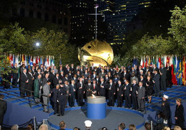 罹難者人數最多的紐約世貿廢墟是今天全美紀念活動的中心,數以萬計的人今天早晨聚集在這里聆聽每一位罹難者的名字,沿著長長的斜坡走進七層樓深的世貿廢墟中為他們獻花。當暮色降臨的時候,距離世貿廢墟不遠的炮臺公園點燃了一簇火焰,聯合國秘書長安南、美國國務卿鮑威爾、紐約市長布隆博格以及中國外長唐家璇等來自罹難者家鄉的代表一起舉起點燃的蠟燭,悼念死難者。與此同時,紐約的五個行政區的公園里也聚集了眾多的市民,搖曳的燭光寄托著對逝者的思念。