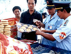 中秋節(jié)前夕,山東棗莊的工商人員在集市上檢查月餅質量,以保證消費者在中秋節(jié)吃到質量信得過的月餅。 作者:高貴軍