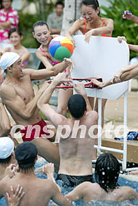 新絲路中國模特大賽選手二十日在三亞進行包括游泳、乒乓球、水球等體育技能比賽,展示T型臺下的風采。作者:毛建軍