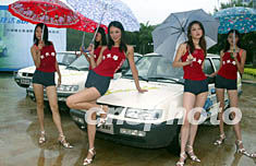 中國首批柴油轎車--捷達柴油環保轎車二十日在海南三亞舉行向市場投放儀式,新絲路模特大賽女選手雨中演出環保秀。環境優美的三亞市率先在國內推廣柴油環保轎車,以進一步保護環境。作者:毛建軍