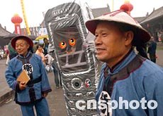 九月山西平遙國際攝影大展上,外國手機廣告卡通與仿古衙役相聚助興。作者:賈國榮