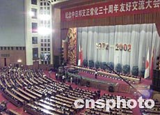 紀念中日邦交正常化三十周年友好交流大會今晚在人民大會堂舉行。一萬三千余名日本來賓會聚于此,與中方各界人士共同紀念這個對兩國人民都具有重要意義的日子。會上,江澤民主席代表中國政府和人民并以他個人的名義對這次活動的成功舉辦表示祝賀,向參加活動的各位日本朋友表示歡迎。