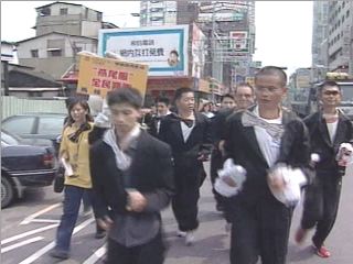 中新網(wǎng)9月29日電 臺中市28日有一場馬拉松比賽,參賽者比一般選手更辛苦,因為他們必須模仿影星成龍在新片中的造型,大熱天里身穿燕尾服跑一段路,還要將漏氣的腳踏車輪胎打滿氣,再騎著腳踏車到終點,才能成為贏家。