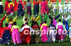 十月十四日舉行的韓國釜山亞運會閉幕式上,韓國主人用歌舞歡送亞運健將歸鄉。作者:潘索菲