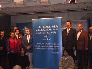 江澤民主席訪美前夕,中國國務院新聞辦在美國首都華盛頓的威爾遜中心舉辦“歷史的記憶”展覽,江澤民為在“二戰”中“駝峰航線”上犧牲的美國飛行員吉米.福克斯題詞。中美兩國老兵和當年參加救援的中國村民代表及其他們的親屬在題詞邊合影。