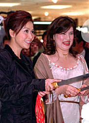 浪琴表亞洲形象大使劉嘉玲、浪琴表中國及香港地區總裁麥姬麗(右)十九日在北京當代商城為“浪琴”一百七十周年慶典巡展揭幕。作者:鄭萍萍
