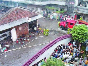 另據(jù)一位目擊者介紹,5輛消防車及時(shí)趕到現(xiàn)場搶險(xiǎn),20多名消防隊(duì)員趕到現(xiàn)場后,立即向發(fā)生爆炸和燃燒的磚房射水,隨后幾名隊(duì)員冒著生命危險(xiǎn)沖進(jìn)火海,用手將10多個(gè)煤氣瓶抱出來。經(jīng)過半個(gè)小時(shí)的努力,終于將大火撲滅。據(jù)圍觀群眾介紹,他們當(dāng)時(shí)看到有幾個(gè)人滿頭是血地從濃煙里跑出來,推測至少有好幾個(gè)人受傷。但傷亡情況至今不明。