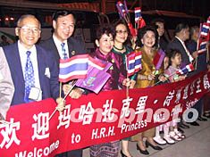 專程從泰王國飛抵?谟釉娏胀ü鞯囊话俣嗝﹪D相l親,在機場拉起了寫著泰文與中文的橫幅,揮舞著中國、泰國國旗,在十五的滿月下笑迎詩琳通公主。