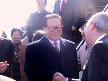 國務院副總理錢其琛及夫人周寒瓊、中央政策研究室主任滕文生、外交部副部長李肇星、中央政策研究室副主任王滬寧、中央辦公廳副主任由喜貴、外經貿部副部長馬秀紅和國臺辦副主任周明偉等江澤民主席訪美的陪同人員同機抵達芝加哥。國家發展計劃委員會主任曾培炎已先期抵達。中國駐美大使楊潔篪、中國常駐聯合國代表王英凡到機場迎接江澤民主席一行。(完)