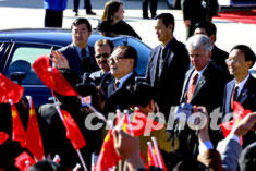 江澤民主席應布什總統邀請訪問美國,二十二日抵達芝加哥奧黑爾機場,向前來迎接的各界人士揮手致意。作者:王瑤