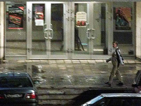 莫斯科時間23日晚間(北京時間24日凌晨),大約40-50名車臣武裝分子劫持了莫斯科市一家劇院,將700多人扣為人質,已經釋放部分人質。圖為一名被釋放的女人質高舉雙手離開劇院。(春風)