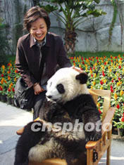香港周凱旋基金會二十四日向成都大熊貓繁育研究基地捐贈五十萬元,終身認養兩只大熊貓。圖為香港周凱旋基金會的代表張培薇女士高興地與大熊貓合影留念。作者:魯彥