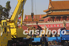 為迎接“十六大”的召開,天安門廣場上的園林工人再次為擺花而忙碌。二十八日,耐寒的松樹被吊車運抵廣場,大批鮮花將再現繁花似錦的景觀。作者:史利