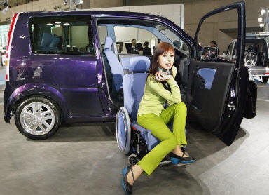 10月29日,在東京汽車展覽會(huì)新聞?lì)A(yù)展會(huì)上,模特展示新型概念車。圖為一款為方便輪椅上下車設(shè)計(jì)的新型車。