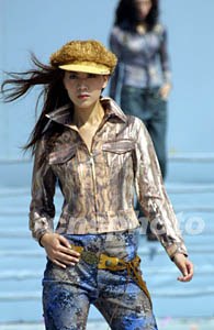 首屆中國廣州〔新塘〕國際牛仔服裝節,二日在中國牛仔服裝最大的加工基地廣州新塘揭幕,模特展示由廣州名師設計的新穎牛仔服裝。