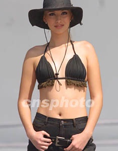 俄羅斯模特展示中國生產的性感牛仔服裝。趙振清 攝