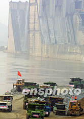 長江三峽大壩截流工地,三日正在緊張有序地向前推進,以確保六日合龍萬無一失。作者:宋吉河