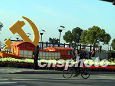 金秋菊展是浙江寧波鎮海傳統的盛大展會。喜迎中共“十六大”的主題則是今年菊展的一大看點。圖為正在當地沿江綠地上展出的“南湖紅船”景點。作者:崔煜芳