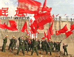 圖:截流成功現場工程人員在圍堰上揮舞紅旗慶賀