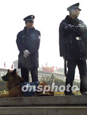 十一月六日,在中共十六大代表陸續抵達北京時,北京天安門通過地下通道進入廣場的人員都需通過警犬檢查。作者:廖文靜