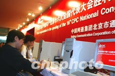 一名前來采訪中國共產黨第十六次全國代表大會的記者六日在北京梅地亞中心查閱中共十六大專題網站資料。即將召開的中國共產黨第十六次全國代表大會引起中外媒體的廣泛關注。作者:毛建軍