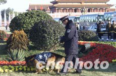中共十六大十一月八日在北京人民大會堂召開,北京警方出動警犬在天安門廣場進(jìn)行安全檢查。作者:滿會喬