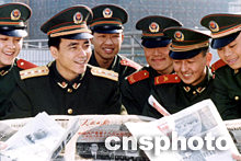 黨的十六大勝利召開引起部隊官兵的廣泛關注,連日來,武警南京市支隊充分利用每天“聽廣播、讀報、看新聞聯播”三個“半小時”時間,及時組織部隊收聽收看黨的十六大會議報道,激勵青年官兵立足軍營建功立業的豪情壯志,永遠做黨和人民的忠誠衛士。圖為11月9日午休后,八中隊中隊長婁曙光(圖中)組織戰士們閱讀當天報紙。中新社傳真 吳俊攝