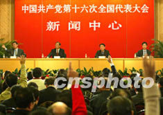 中共“十六大”十日在北京的新聞中心舉行記者招待會,中外記者爭相舉手向國家發展計劃委員會主任曾培炎和國家經貿委主任李榮融提問。作者:毛建軍
