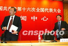 在北京召開的中共十六大十日舉行中外記者招待會,國家發展計劃委員會主任曾培炎(左)和國家經貿委主任李榮融成為新聞人物。作者:毛建軍