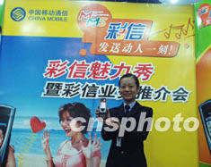 海南移動公司12日在此間舉行彩信業余推介會,數百名推崇移動電話個性化的用戶現場觀摩了彩信新功能,海南移動電話進入彩信新時代。圖為演示現場移動公司工作人員介紹彩信的使用方法和特點。作者:王辛莉