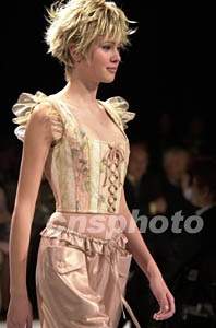 東京十一月舉行的二00三年春夏時裝展上,米黃系列的清爽短裝與發式膚色融為一體。作者:陶光雄