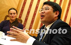 中共十六大代表、山東大學(xué)校長展?jié)战邮芡鈬浾咴L問,談高等教育改革與建設(shè)問題。作者:毛建軍