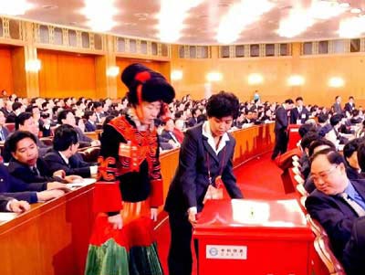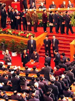 江澤民、李鵬、朱镕基、李瑞環(huán)、胡錦濤、尉健行、李嵐清已相繼在位于主席臺(tái)正中的票箱投票。同時(shí),代表和特邀代表們也開始投票。