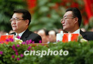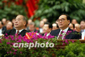 李長春與吳邦國在主席臺上出席會議。