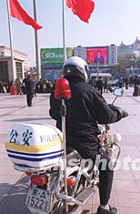十五日中午,北京火車站廣場直播新一屆中共中央政治局常委與記者的見面會。北京警察加緊巡邏,保證民眾觀看直播。作者:張宇